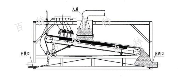 礦漿通過(guò)入料管道進(jìn)入本磁選機(jī)的均勻進(jìn)料裝置,經(jīng)過(guò)充分分散后被均勻的灑落在磁板上部的卸鐵皮帶上,在重力作用下漿料沿磁板的傾斜方向向下流動(dòng),漿料中含有的鐵磁性物在磁棒提供的強(qiáng)磁場(chǎng)下,被牢牢的吸附在卸鐵皮帶上,電機(jī)傳動(dòng)裝置驅(qū)動(dòng)卸鐵皮帶沿磁板傾斜方向向上運(yùn)動(dòng),同時(shí)將吸附的鐵磁性物帶入卸鐵區(qū)域,被卸鐵水管沖洗水沖入尾礦斗中被集中收集,無(wú)磁性漿料繼續(xù)沿磁板向下流動(dòng),流入精礦斗被集中收集。